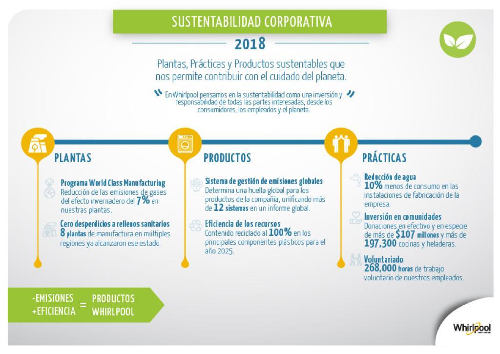 El reporte de Whirlpool destaca el progreso y los logros de la compañía en el año operativo 2018, con resultados en sus esfuerzos por reducir las emisiones de gases de efecto invernadero en sus instalaciones y la cantidad de recursos naturales necesarios en la manufactura de sus electrodomésticos.