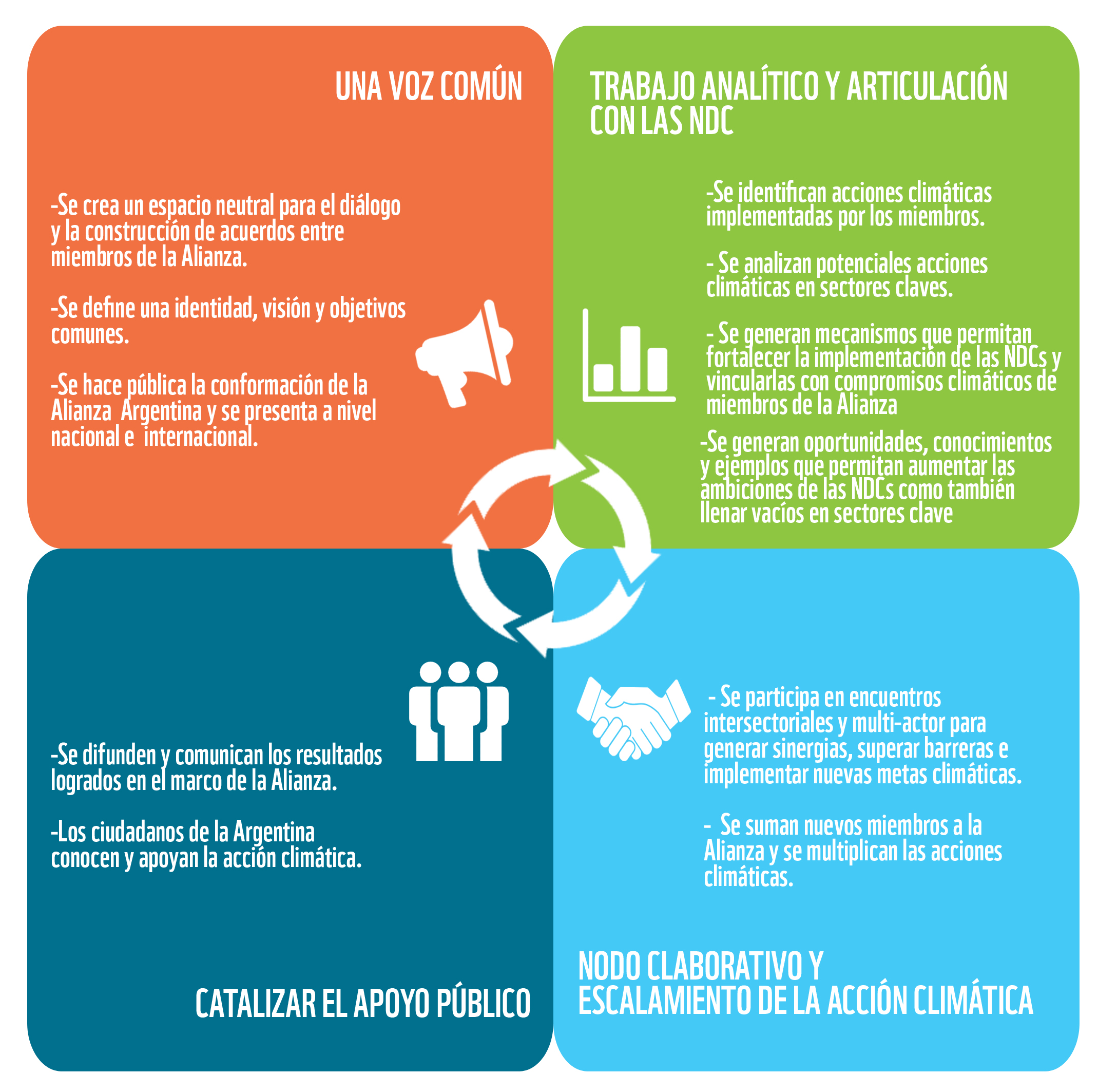 En este sentido nacen las Alianzas para la Acción Climática, una iniciativa global de la Organización Mundial de Conservación (WWF por sus siglas en inglés), Fundación Avina, CDP, C40, CAN, The Climate Group y We Mean Business. Estas Alianzas buscan articular y fortalecer a los actores locales para acelerar la transición a sociedades bajas en carbono y resilientes al clima, implementando y acelerando los Contribuciones Nacionalmente Determinadas (NDCs por sus siglas en inglés).