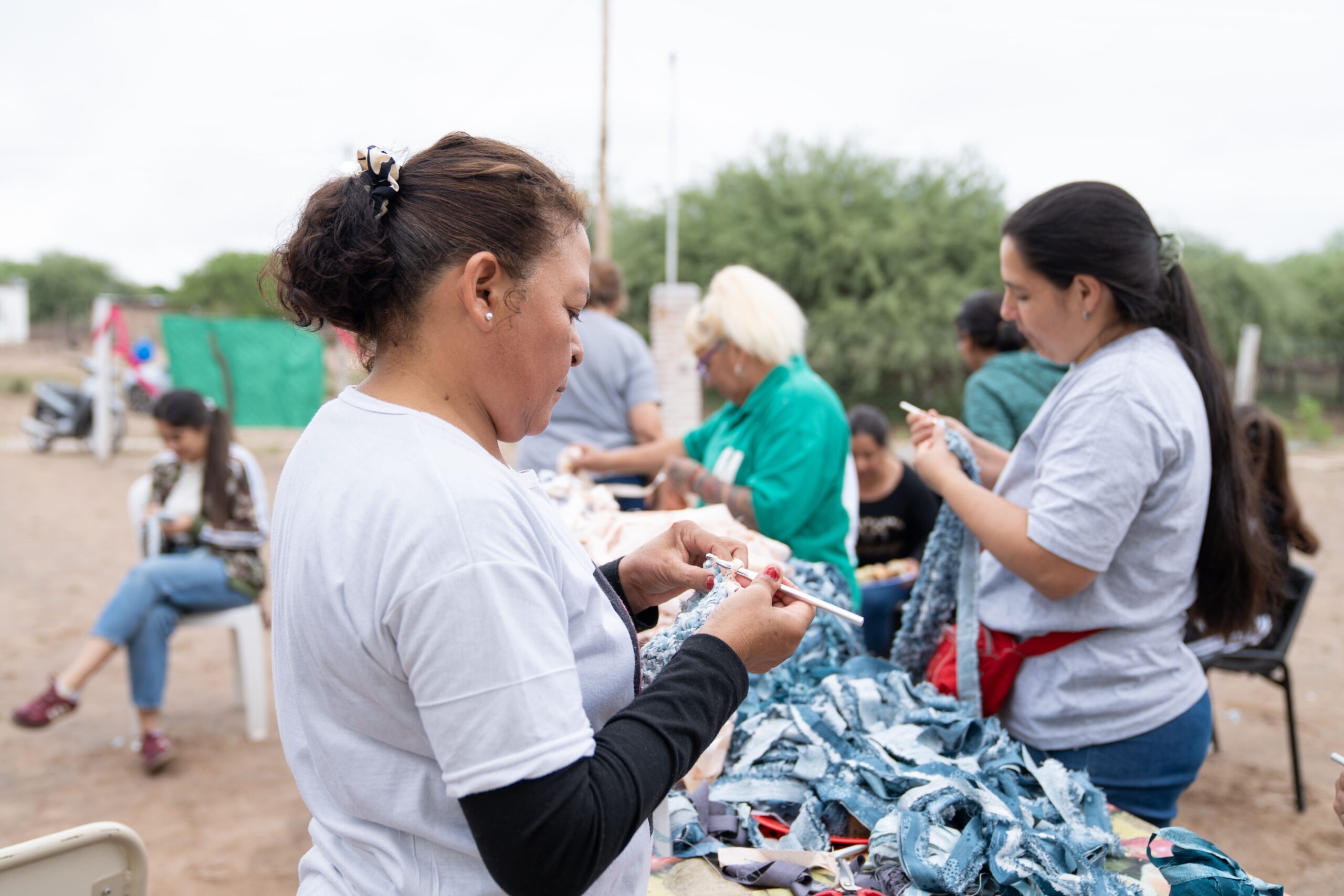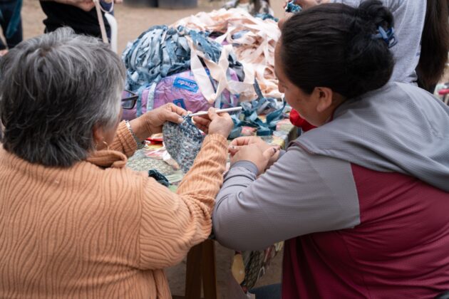 Durante la jornada, 24 mujeres del paraje y zonas aledañas aprendieron técnicas de costura a máquina y tejido al crochet reutilizando el descarte textil de la marca, explorando posibilidades para transformarlo en productos con valor económico y social.