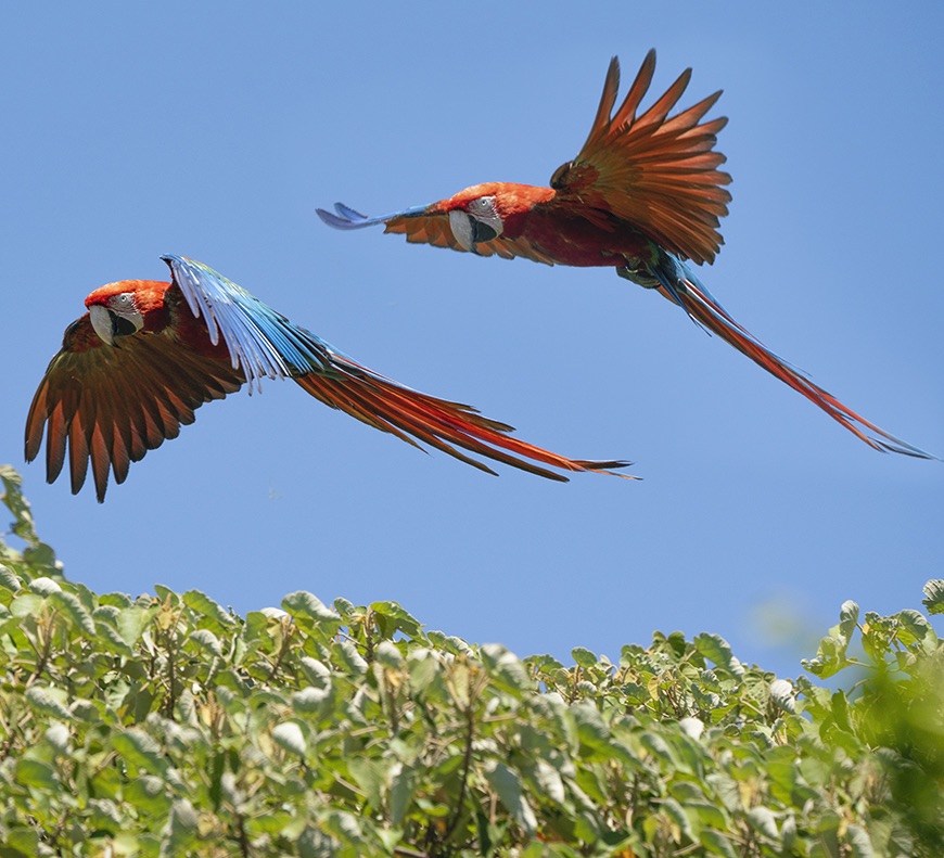 Los recientes incendios en Corrientes enfatizaron la importancia del regreso del guacamayo rojo a esa región como un “regenerador de bosques”, ya que, al alimentarse de frutos de gran porte, ayuda a dispersar sus semillas y de esta forma contribuye a recuperar la estructura y funcionalidad del ecosistema.